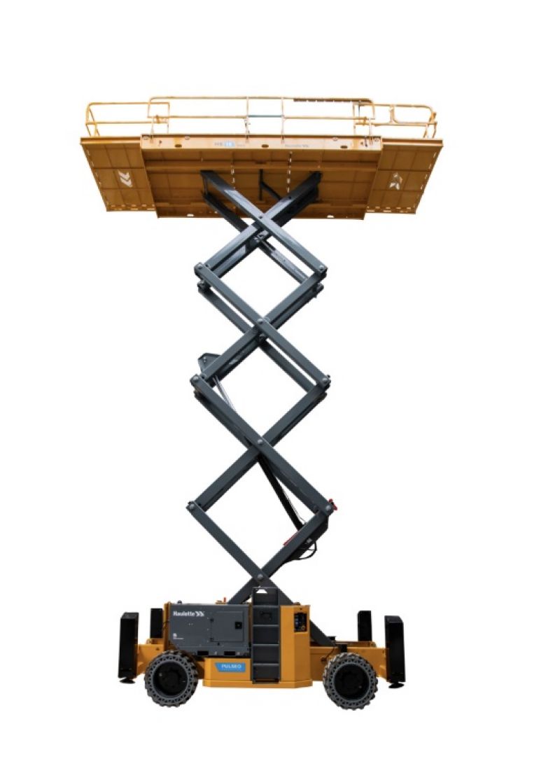 Die robuste geländegängige Scherenbühne Haulotte HS 15 E PRO arbeitet vollelektrisch. Zusätzlich zum normalen Ladevorgang über das Netz kann mit einem on Board Hilfsgenerator eine Schnellladung durchgeführt werden. Die Maschine bleibt während des extrem schnellen Ladevorgangs, der beispielsweise in Pausen durchgeführt werden kann, uneingeschränkt betriebsfähig. Die Plattform kann bis auf 7,4 m verlängert werden. Die Stützen können wahlweise automatisch oder einzeln ausgefahren werden. Die Bühne verfügt über nichtmarkierende Räder, Pendelachse und Differenzialsperre.